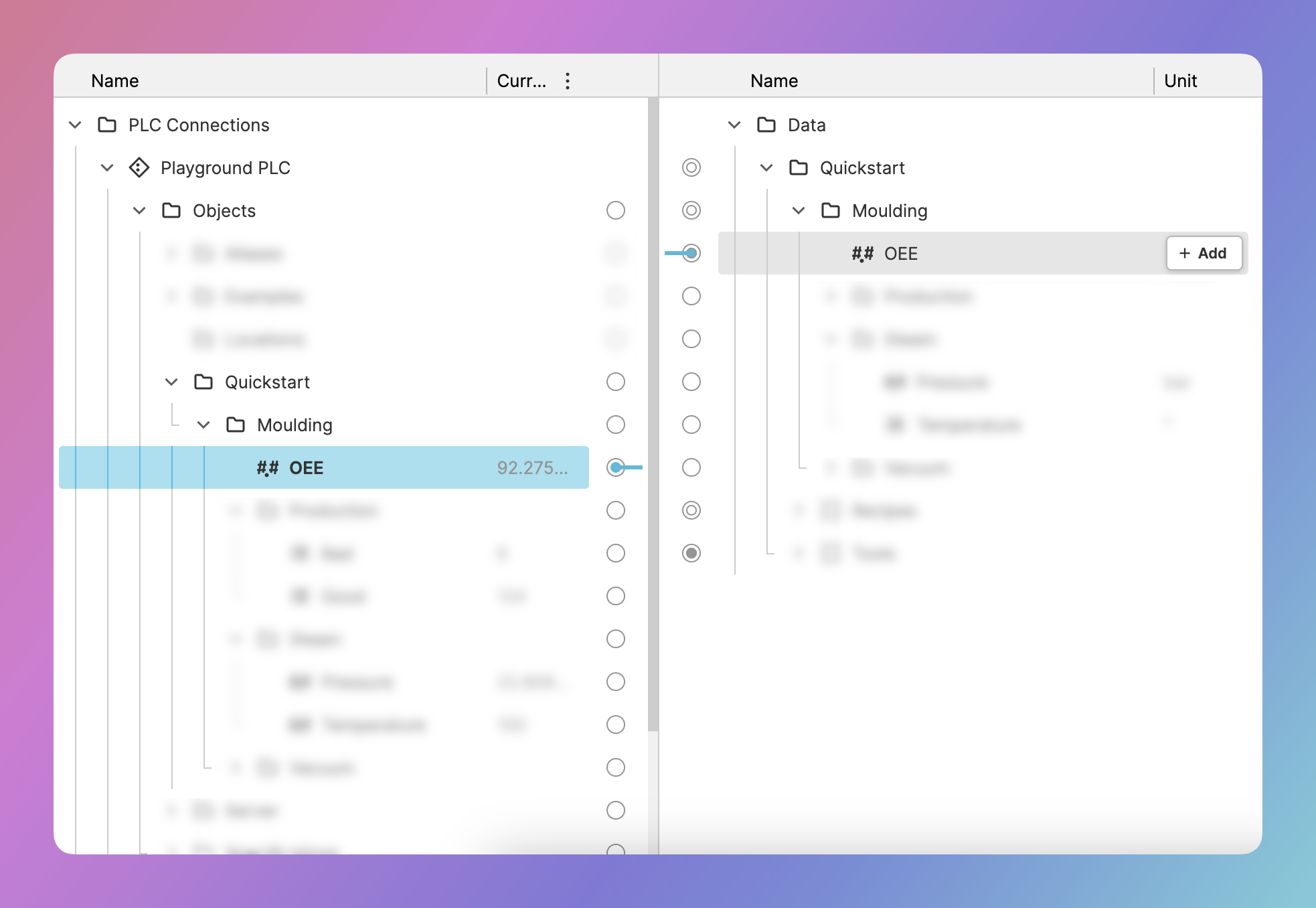Click the circle on the left of the "OEE" variable within the HMI Data Explorer to connect the two values.