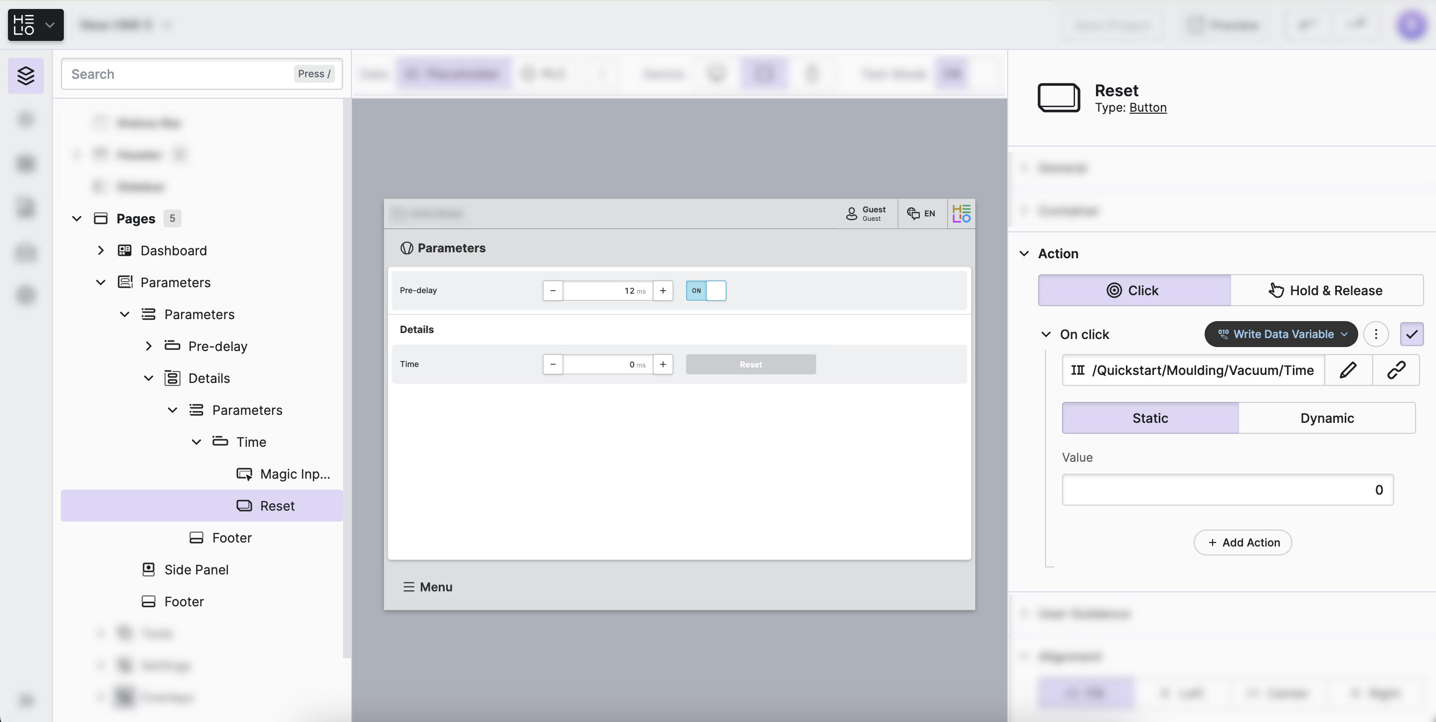 After editing the "Time" Data Variable our operators may need to reset the variable, we will achieve this by adding a button to the parameter.