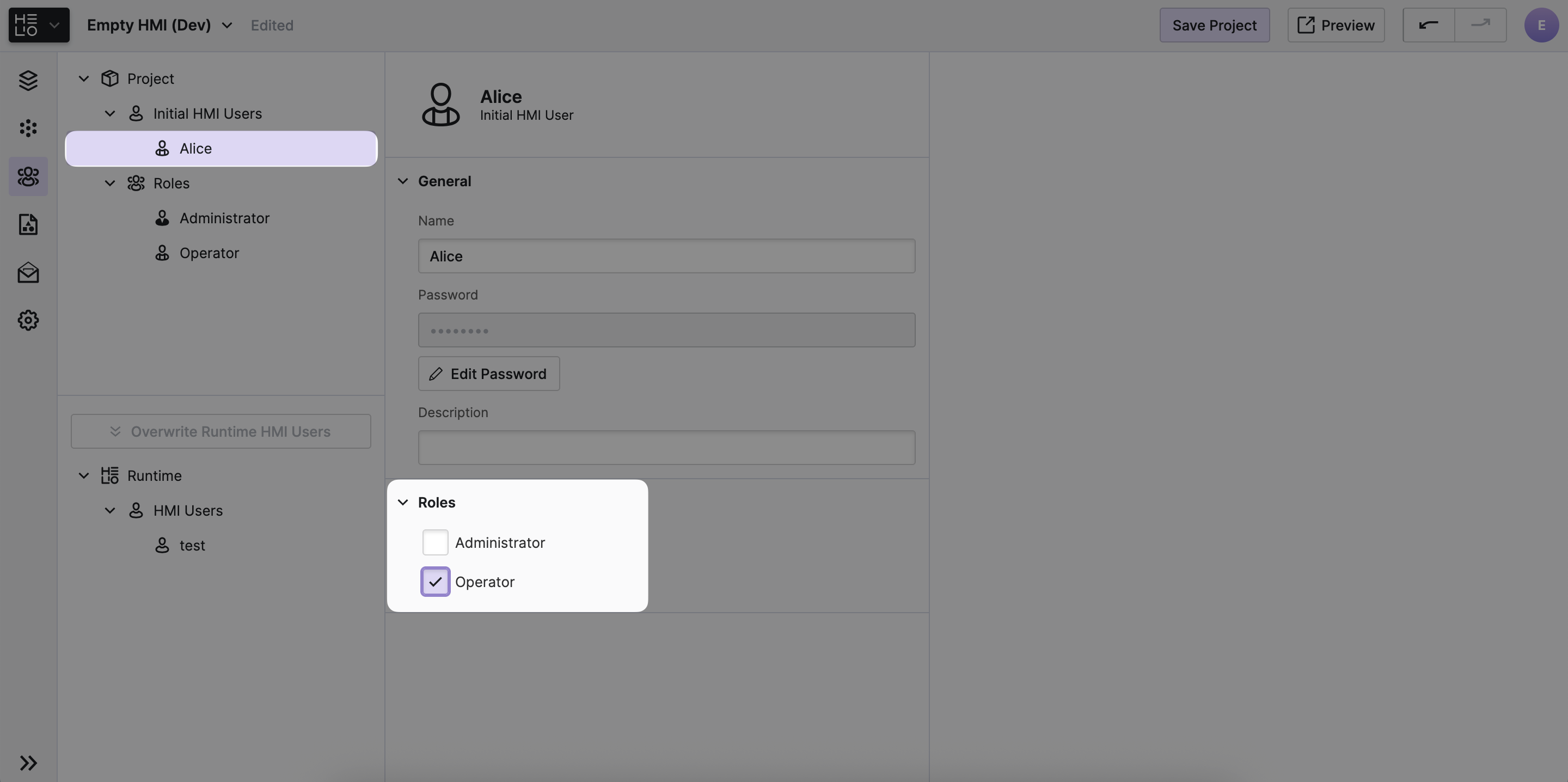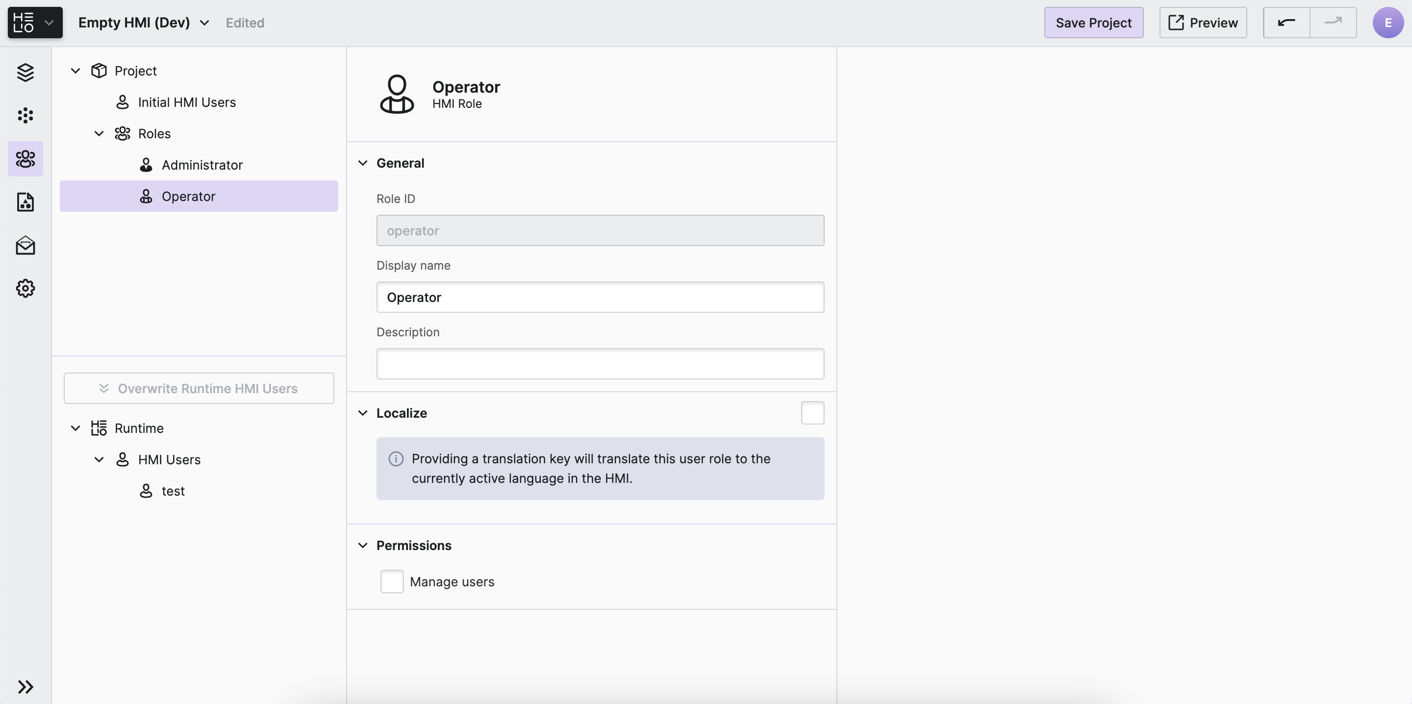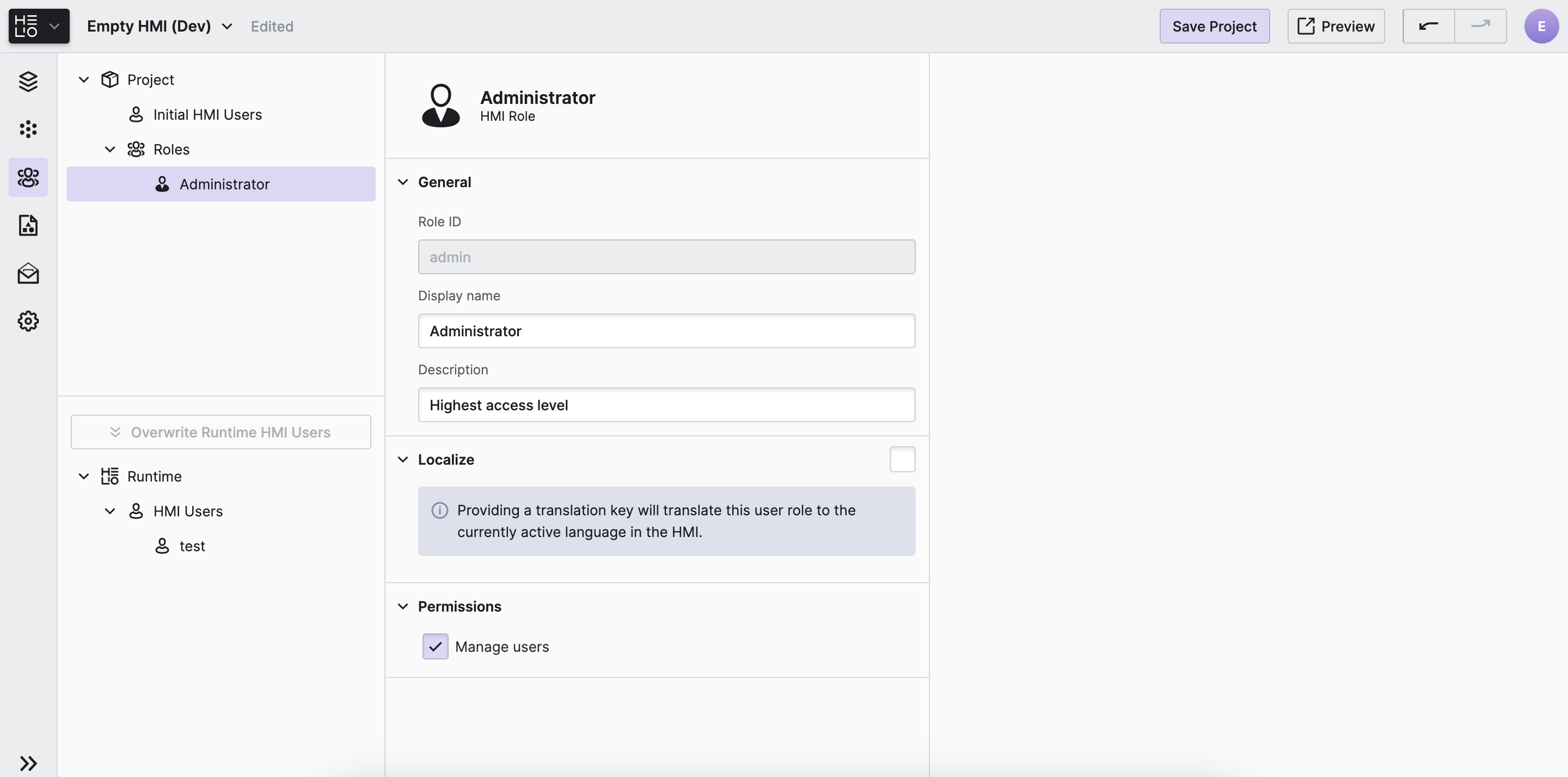- Navigate to the HMI Users View of the Project Editor