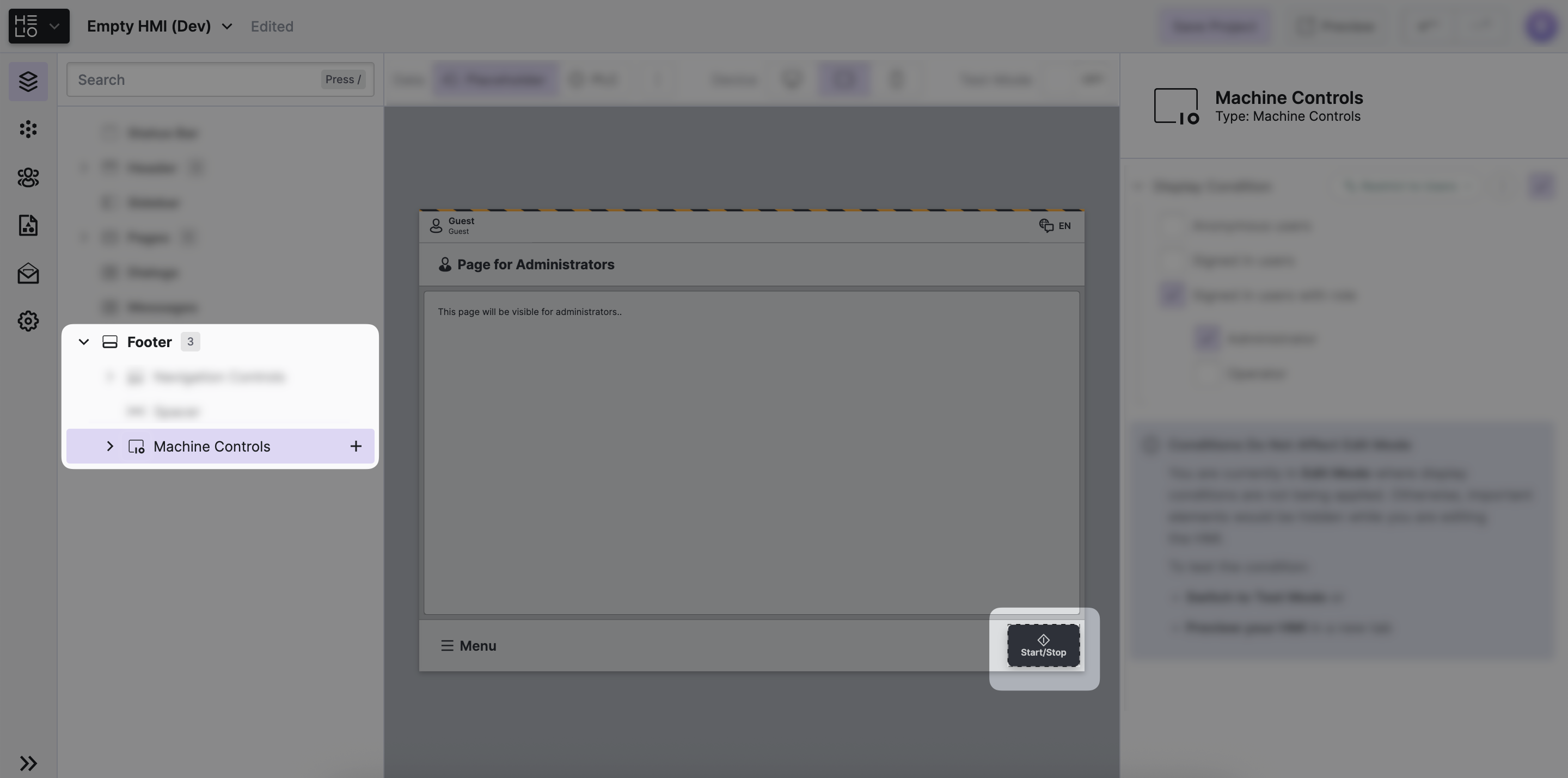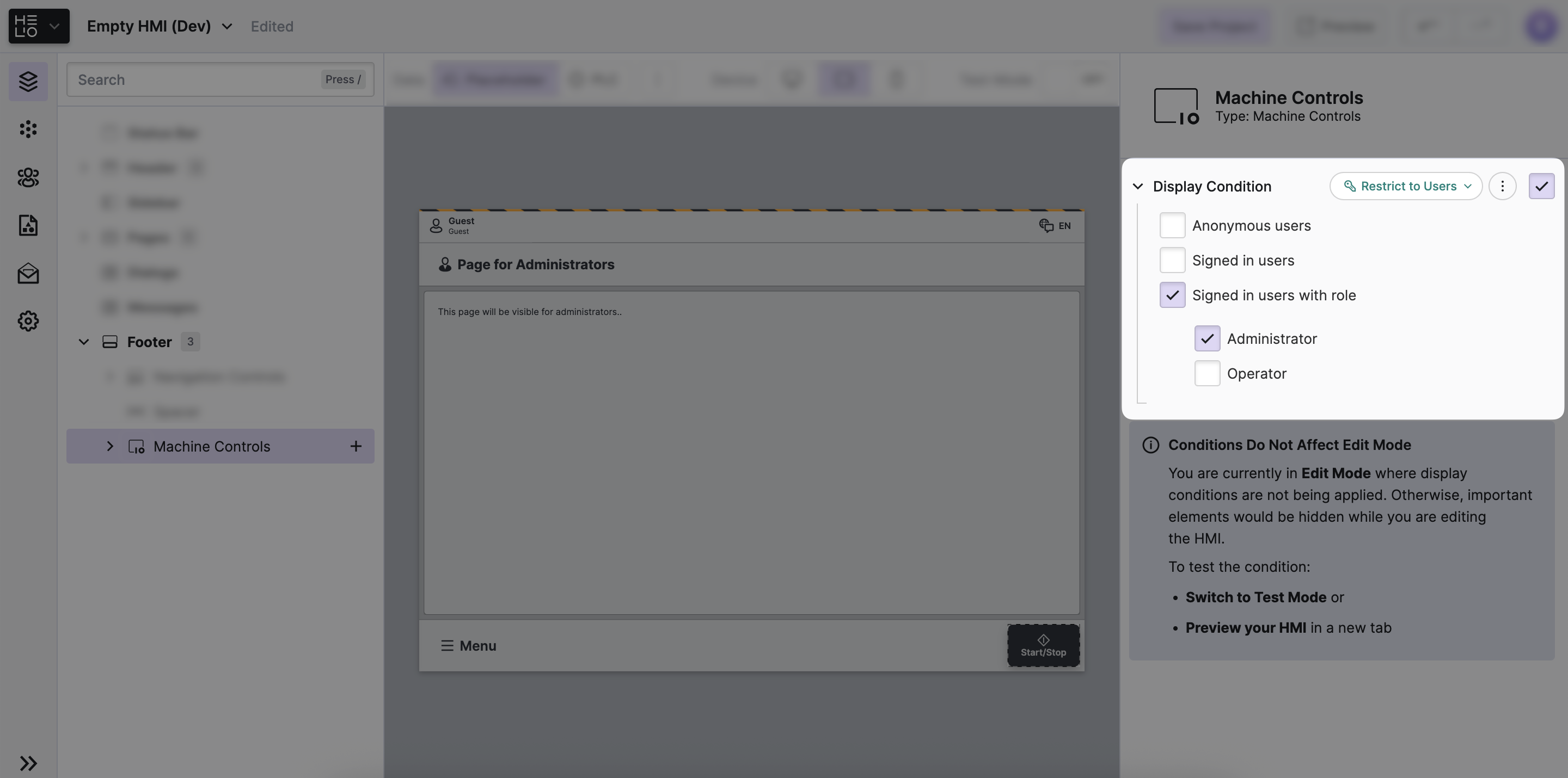 So let's use the Display Condition of the Machine Controls element to make show it when users with Administrator roles are signed into the HMI. Activate the option and choose Restrict To Users as the type of the Condition property.