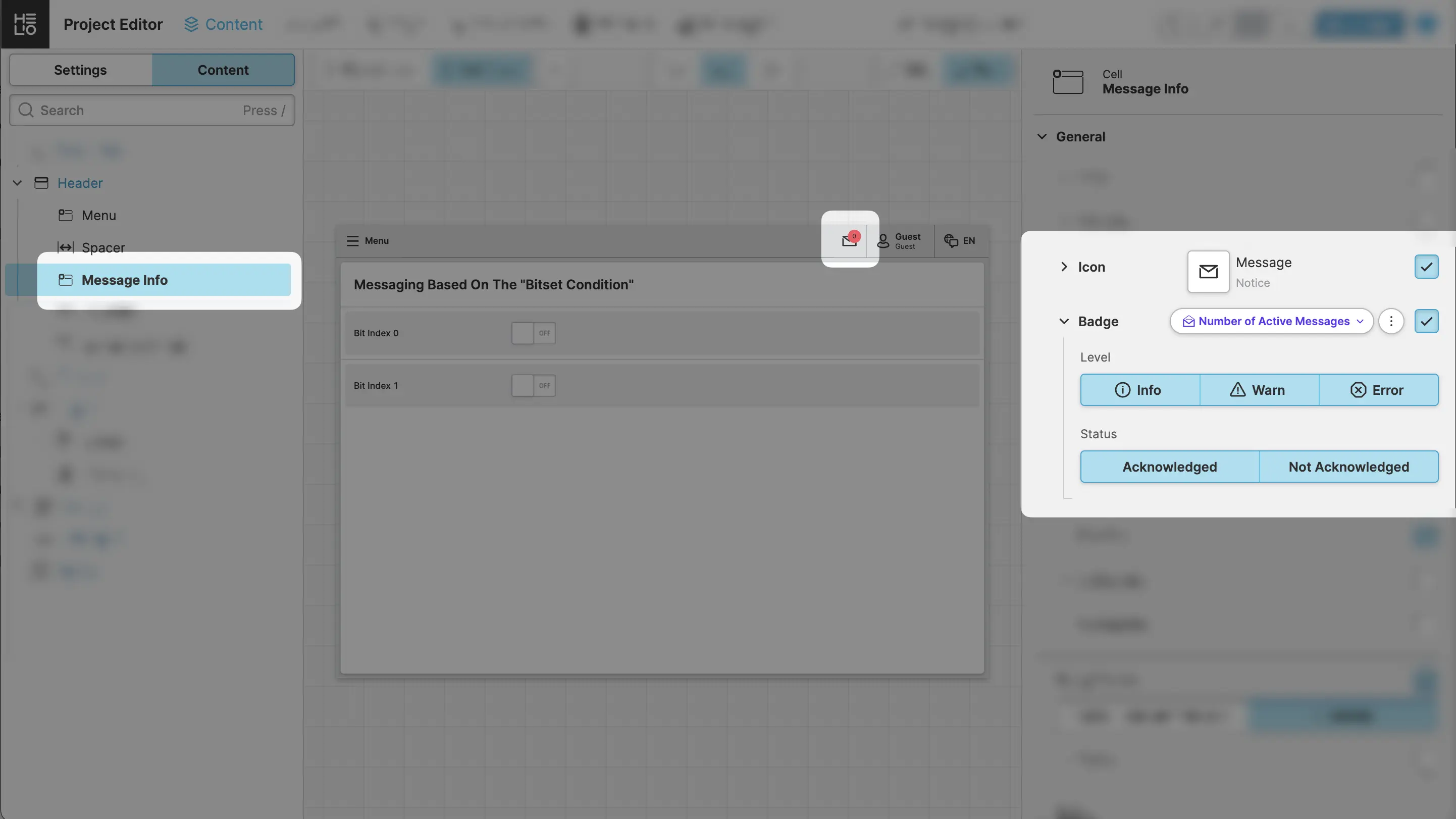 Badgeproperty of the Header Cell element. - Use the Dynamic Property Number of Active Messages and configure it to count all the messages, no matter which status or level.