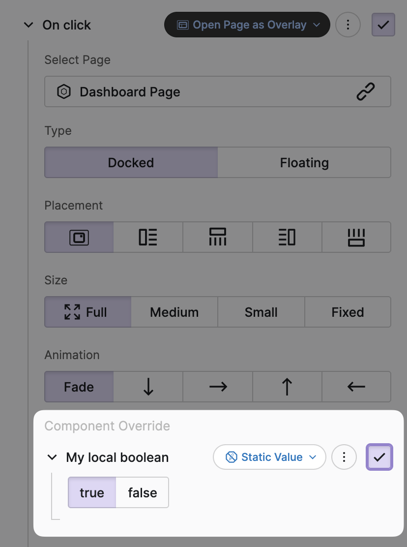 If you have turned a page into a component you can define its component properties as an API that can be used inside the Open Page as Overlay Action later.