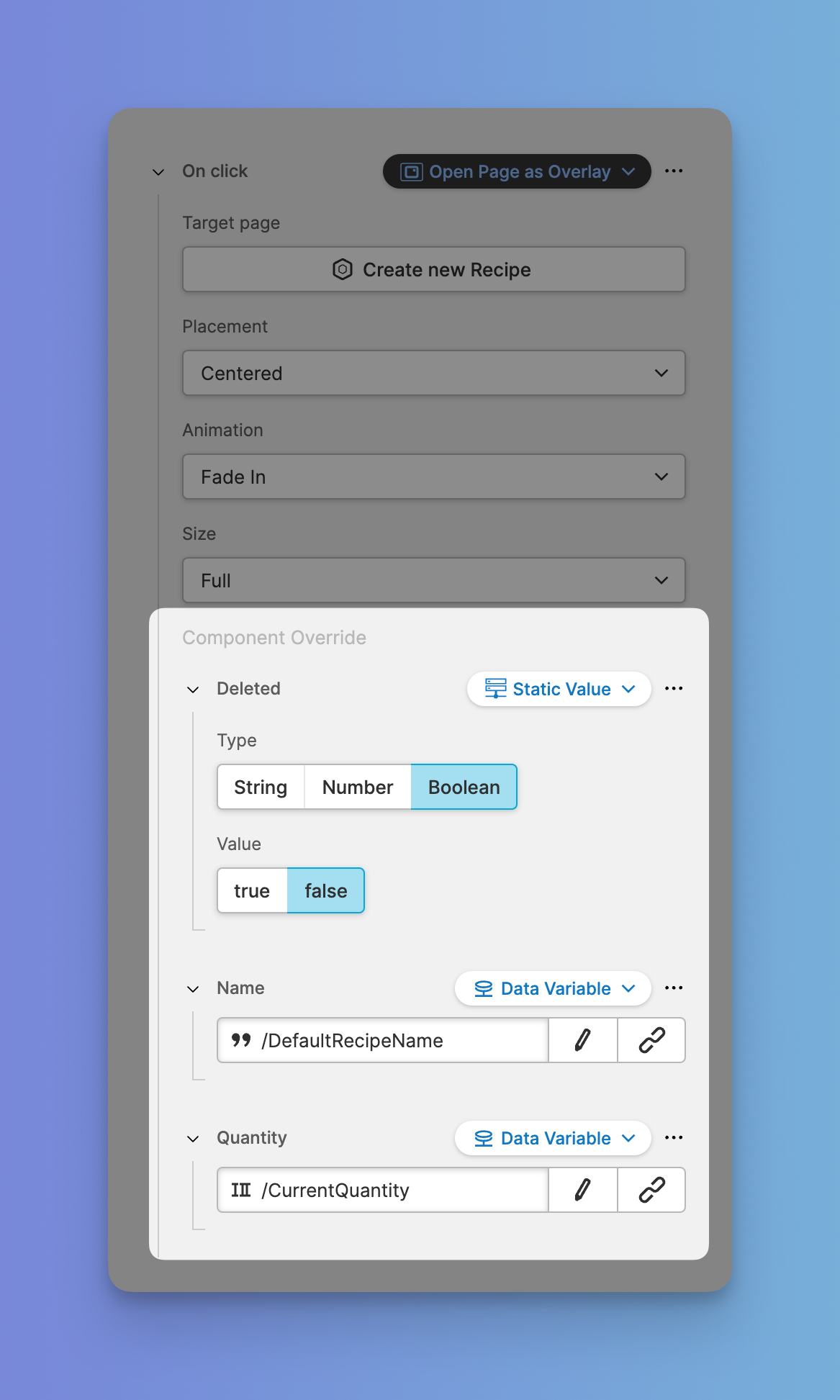 To Open the Page Component, Use the Open Page as Overlay Action and Override its Properties
