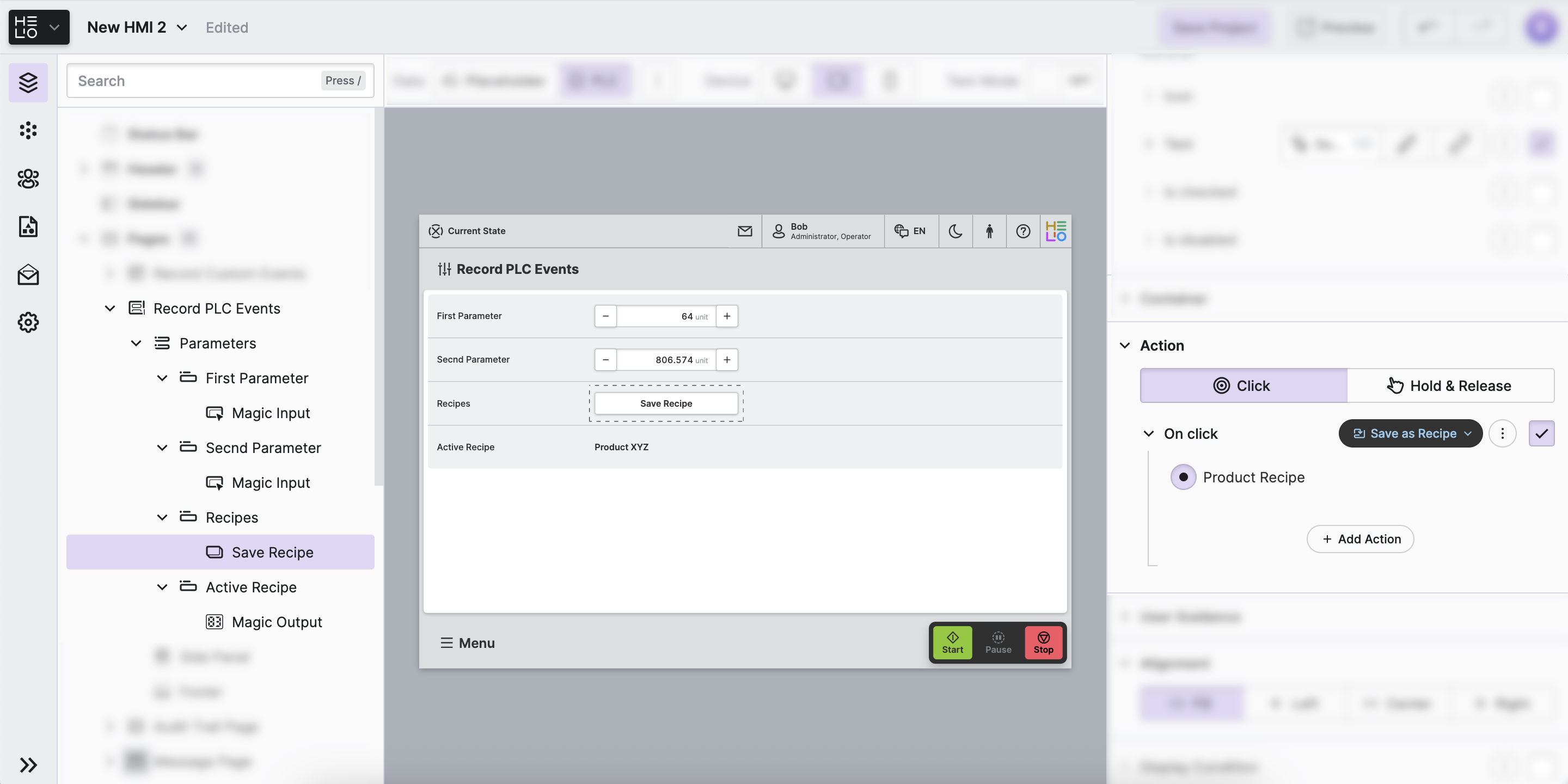 It's time again to put our HMI into production and record some recipe events. Proceed by changing parameters, creating new recipes, and loading and deleting them. Don't forget: