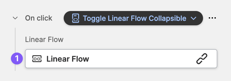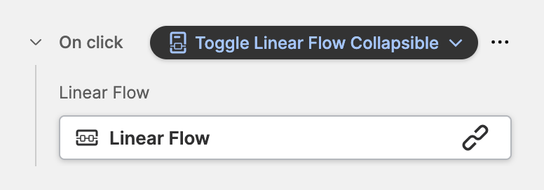 ReferenceActionsOtherToggle Linear Flow CollapsibleVersion: 25.3 (latest)On this pageToggle Linear Flow Collapsible About Toggle all collapsible modules of a linear flow to collapse or expand. Anatomy Linear FlowSelect the linear flow of which all collapsible modules should be toggled. Related ElementsLinear FlowLinear Flow GroupLinear Flow Module