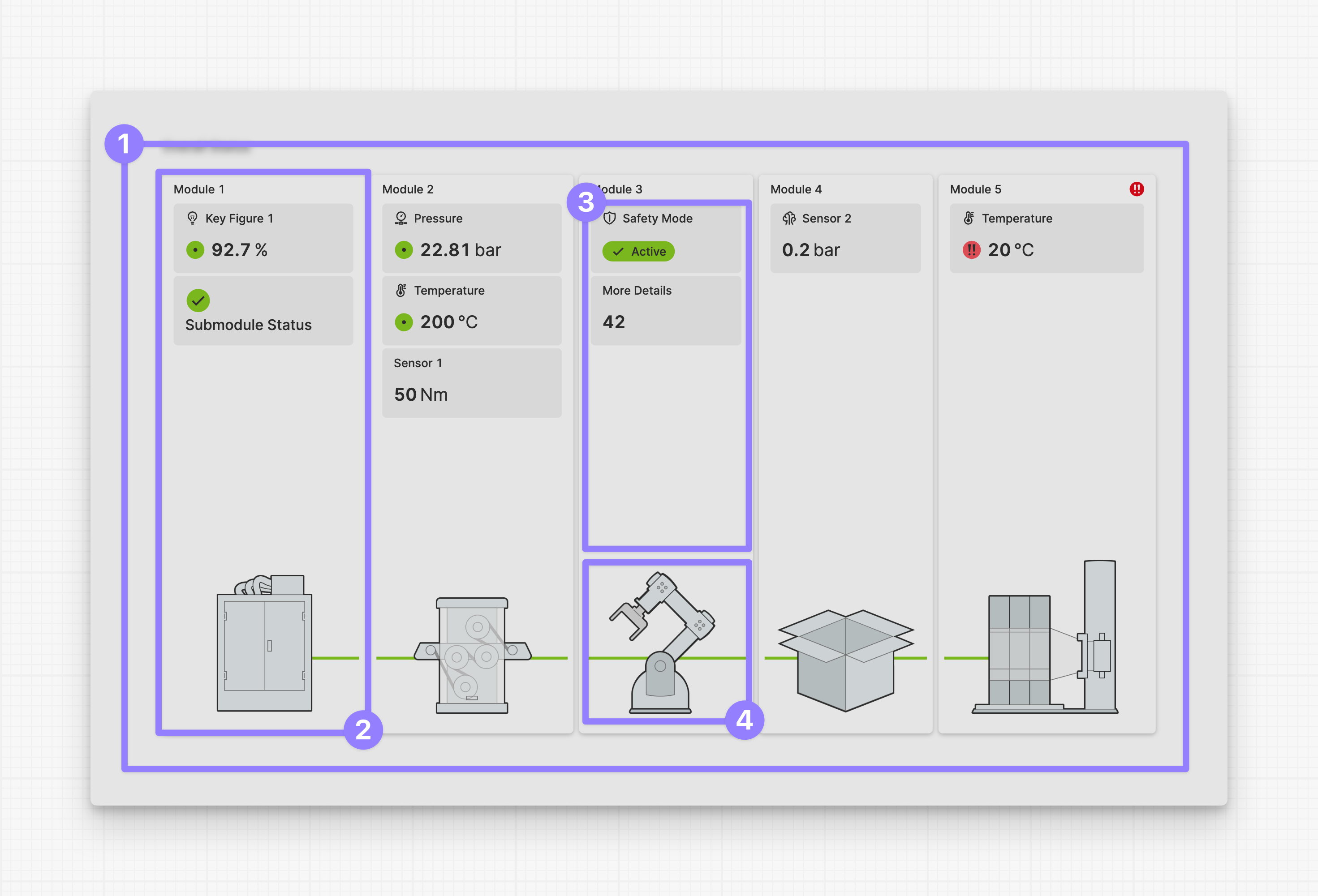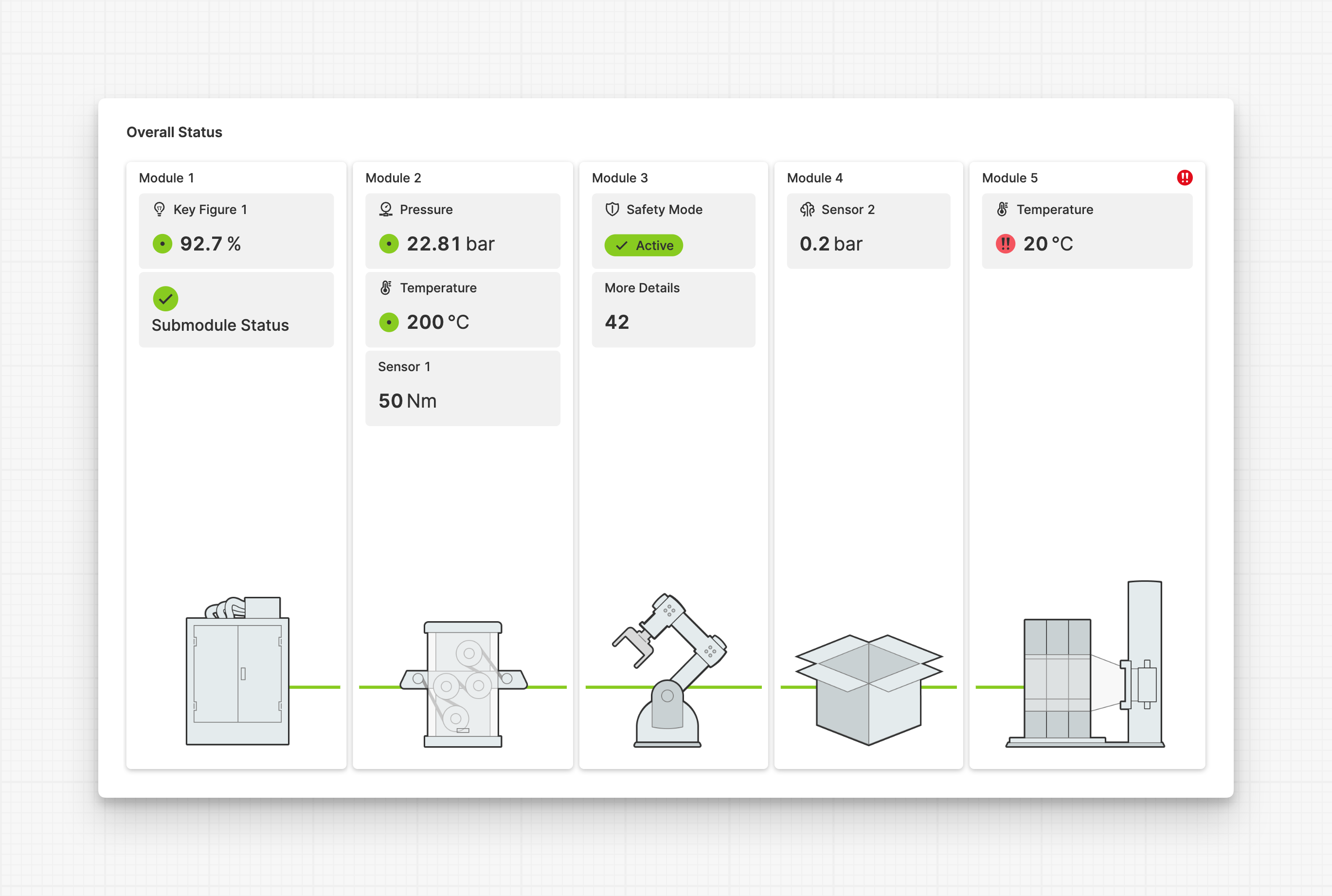 Here you can see a machine that consists of 5 modules. Each module reports its most important key figures. The last module reports an alarming status using an output, as well as the overall module status.