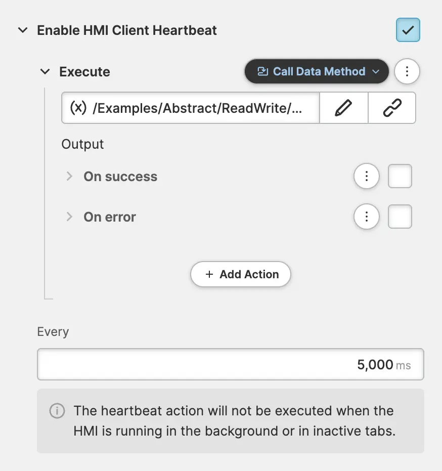 Specify an action that each HMI client should execute repeatedly. In this example a PLC data method will be executed every 5 seconds.