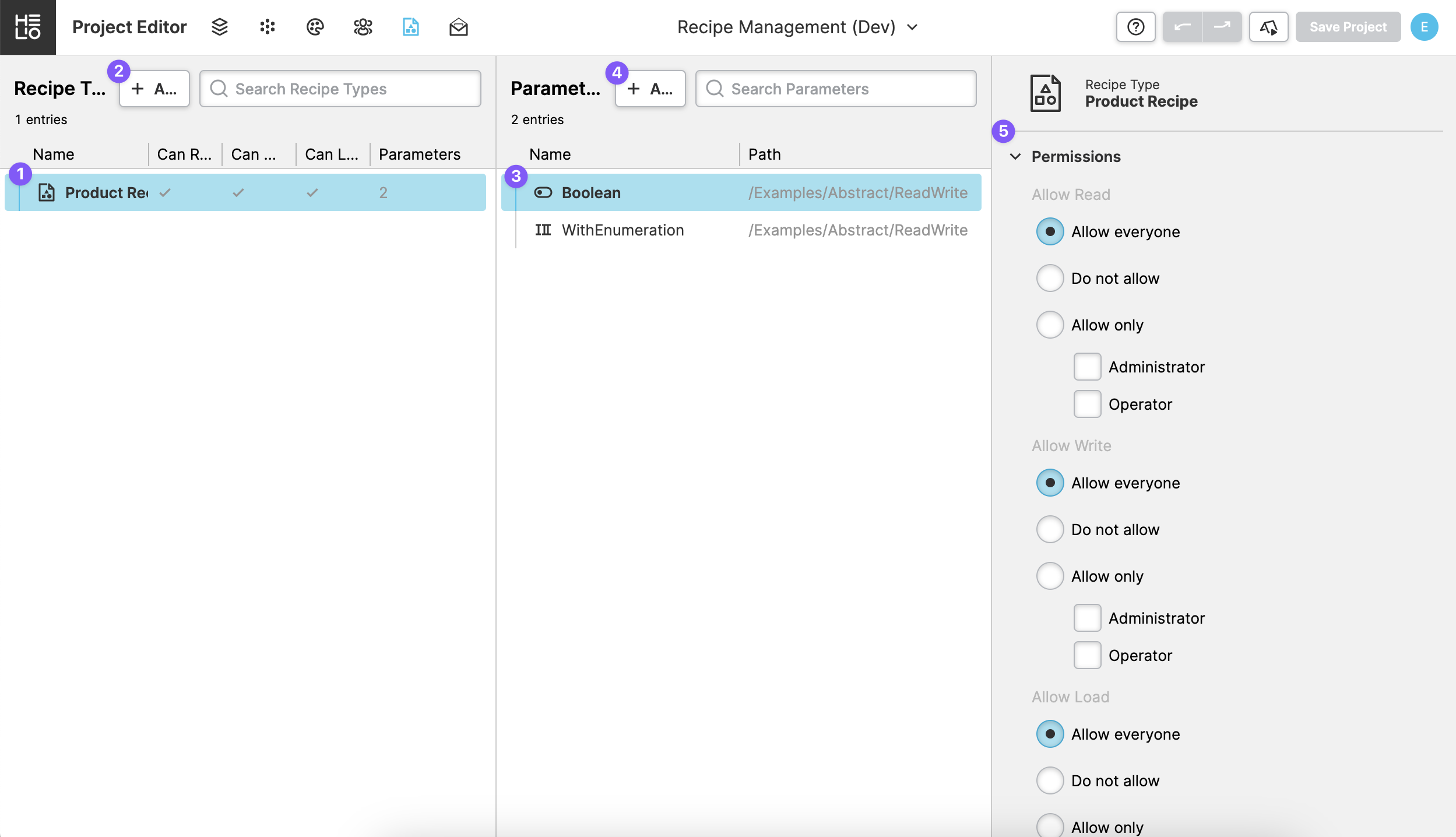 Addbutton to create new recipe types.List of all recipe parameters for the selected recipe type.