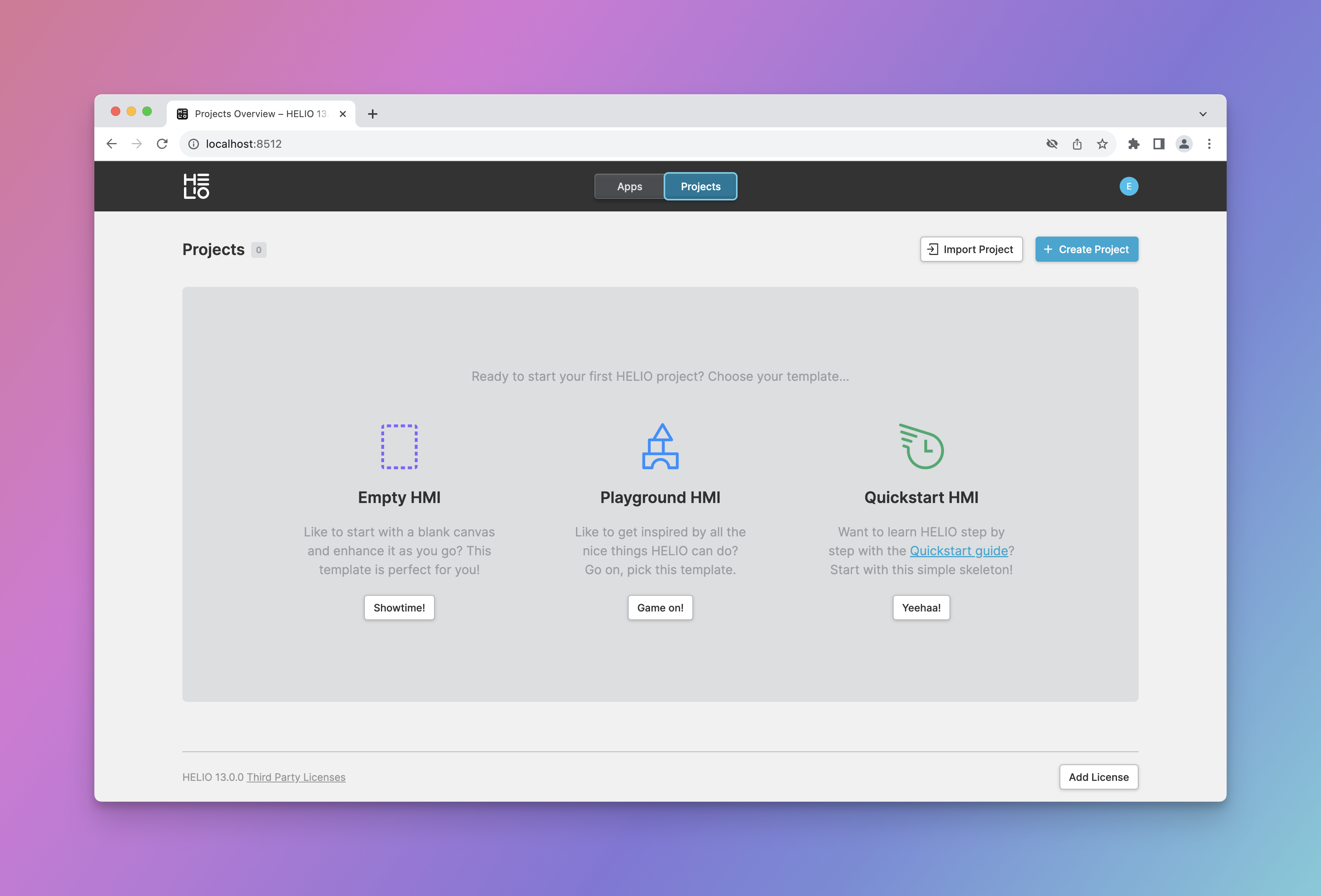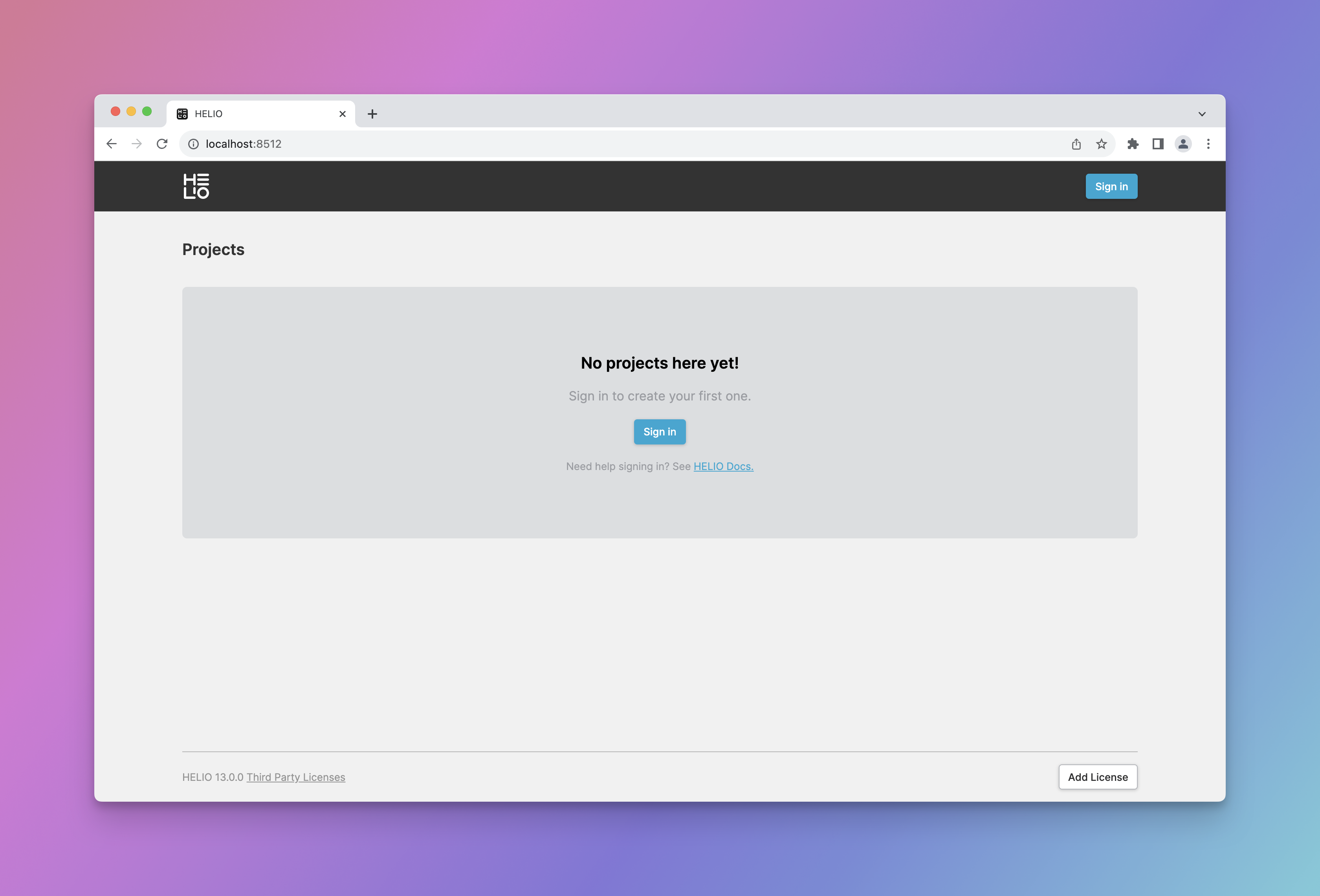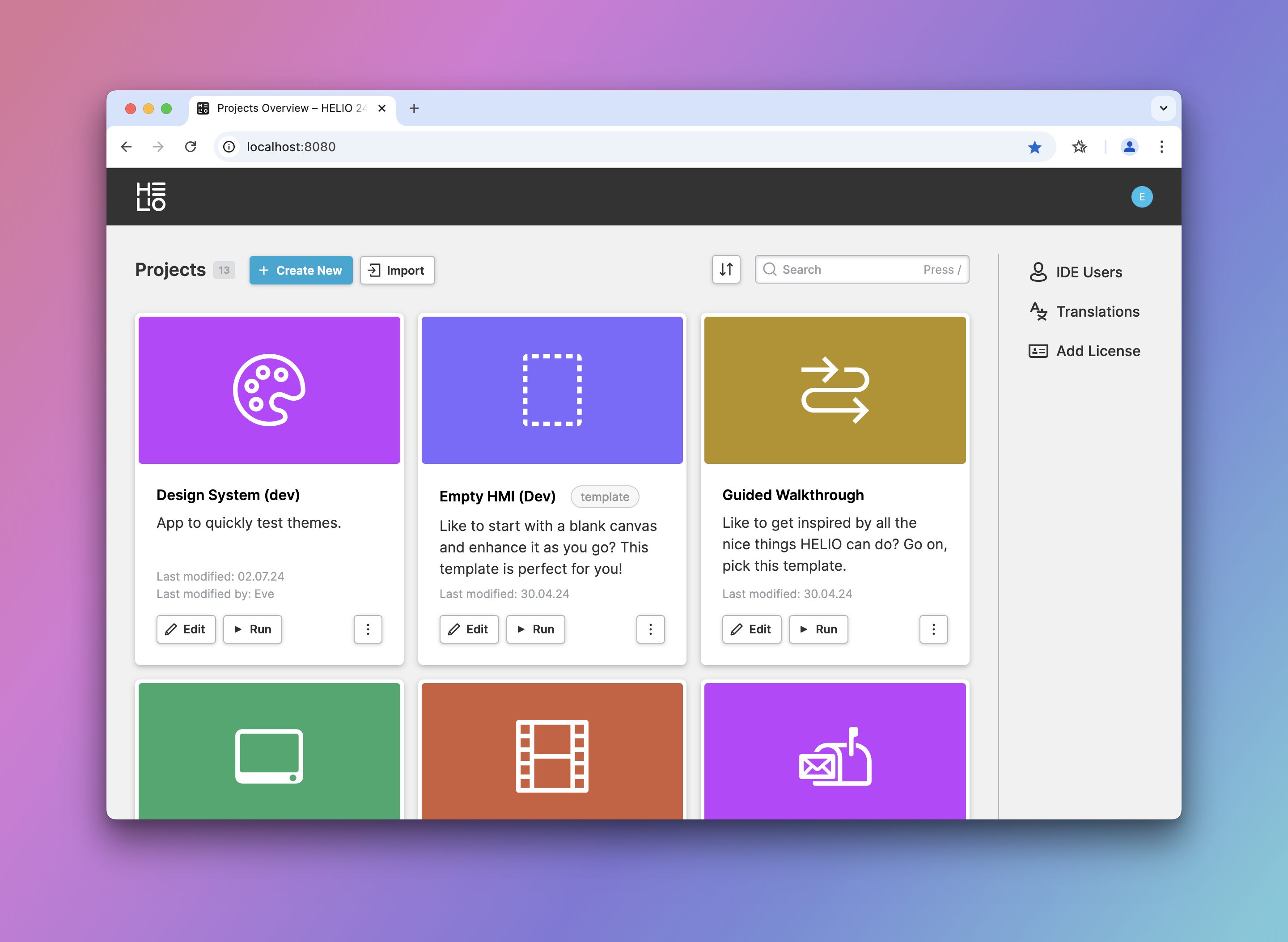 The Welcome Page lists all the projects that you have created. It also features useful Settings (e.g. IDE User Manager, Translation Manager ) that help you to execute management tasks for this HELIO instance.