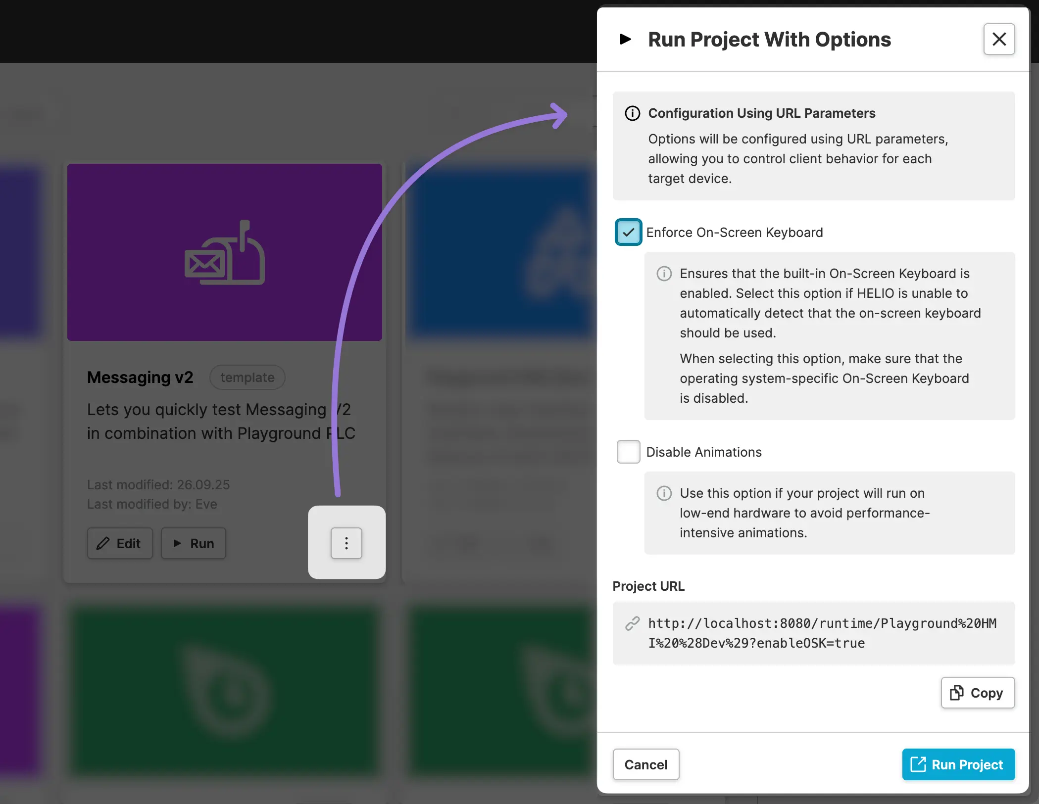 The Welcome Page of the HELIO IDE provides a "Run with Options" action for each of your projects.